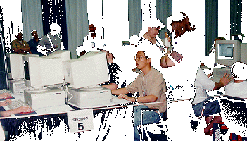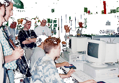 Doug Zartman from Bungie Software, along with several dozen other spectators, watches the excitement of the MYTH final round!